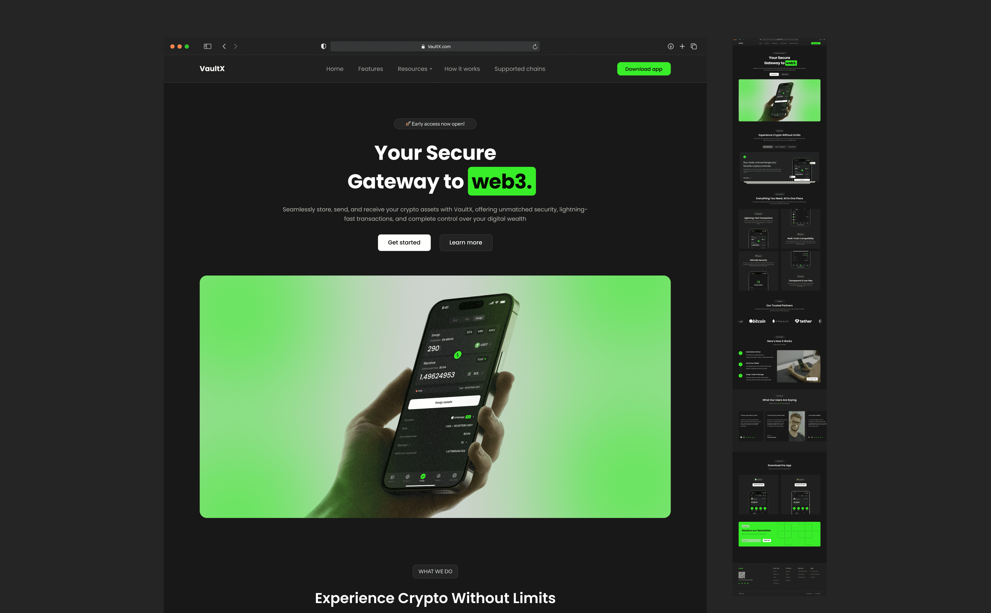 I focused on simplifying the crypto wallet experience by addressing key user pain points like complex interfaces and limited blockchain support. After researching user needs and analyzing competitors, I designed a clean, intuitive UI with a modern dark theme. Using Framer, I prototyped smooth interactions and built a landing page that clearly communicates VaultX’s core value, secure and seamless multi-chain crypto management.